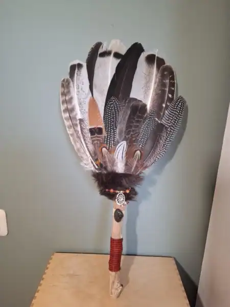 Deze smudge fan is samengesteld uit de veren van kalkoen, pauw, parelhoen, fazant en haan. Een krachtige combinatie van dankbaarheid, bewustzijn, bescherming, zelfvertrouwen en waakzaamheid. Het handvat is een natuurlijke stok uit het bos, bekleed met leer voor een robuuste, aardse uitstraling. Elke fan wordt met de hand gemaakt en voorzien van een edelsteen en symbool, afgestemd op de energie van het geheel. Omdat elk exemplaar met zorg en aandacht wordt gemaakt, is geen enkele smudge fan hetzelfde. De foto is een voorbeeld van wat je kunt verwachten.