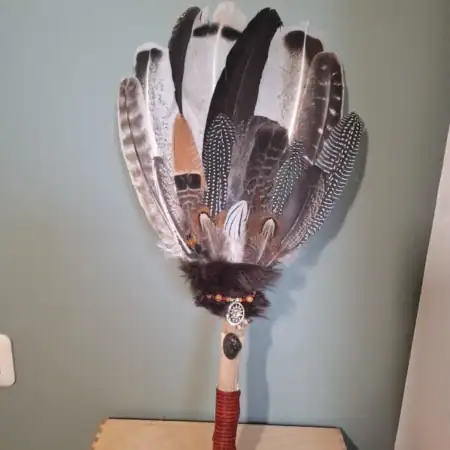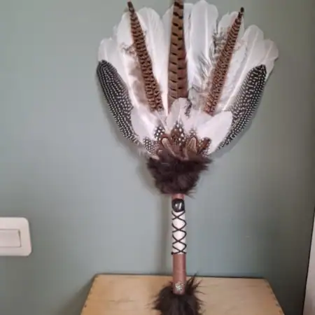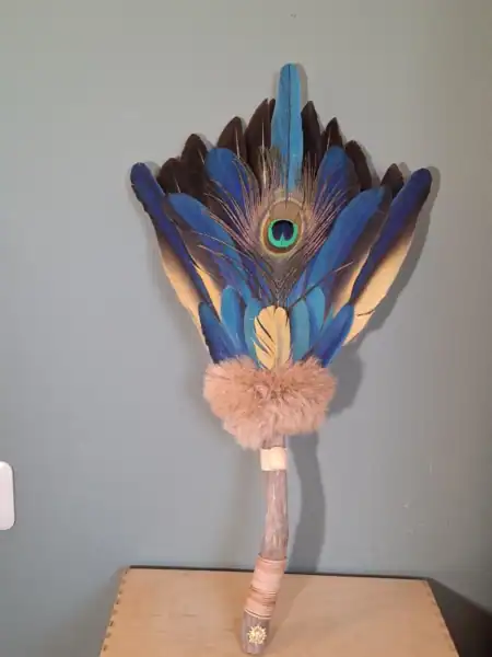 Een bijzondere en opvallende smudge fan met de veren van gans en blauwe ara, met centraal een sierlijk pauwoog als middelpunt. Gans staat voor doorzettingsvermogen en trouw aan je eigen pad, de blauwe ara draagt vrijheid, expressie en heldere communicatie in zich, en het pauwoog waakt over het geheel met zijn beschermende en bewuste energie. Het handvat is een natuurlijke stok uit het bos, stevig bekleed met koeleer voor een krachtige, aardse uitstraling. Afgewerkt met een edelsteen en symbool, volledig met de hand gemaakt en daardoor uniek. De foto is een voorbeeld van wat je kunt verwachten.