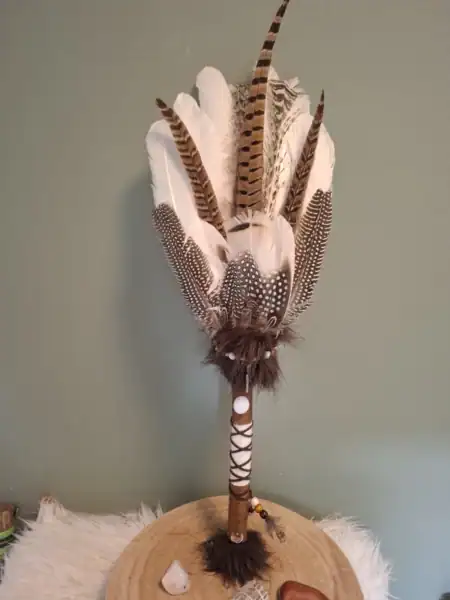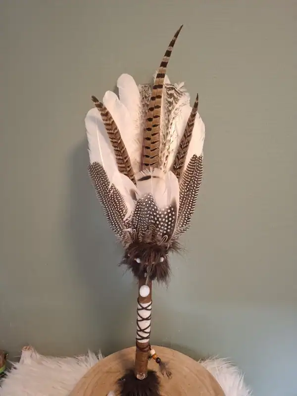 Onze smudge veren worden met zorg en aandacht handgemaakt, vooral met veren die op een natuurlijke manier tijdens de rui zijn gevonden. Op de foto’s zie je voorbeelden van eerder gemaakte smudge veren. Je kunt er één bestellen vergelijkbaar met die afgebeeld, maar we kunnen ook een persoonlijke waaier voor je samenstellen. Zo ontstaat een uniek stuk dat helemaal bij jou past, zowel in uitstraling als in energie.